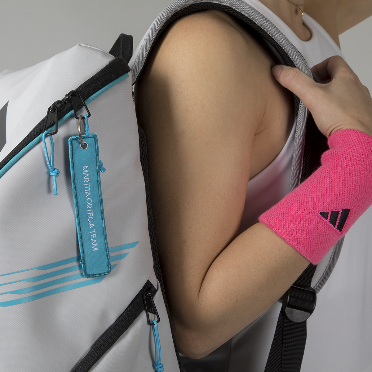 Martita Ortega's new padel backpack is designed to meet the needs of the most demanding players. With a capacity of 40 litres, it is ideal for transporting large belongings such as clothing and sports equipment. Its central compartment features a practical U-shaped zipper closure, making it easy to access all your gear. It has two side pockets with zippers for efficiently organizing personal items. The padded back compartment is perfect for carrying and protecting your laptop. This backpack combines functionality and comfort, and includes an exclusive hangtag with Martita Ortega's signature.